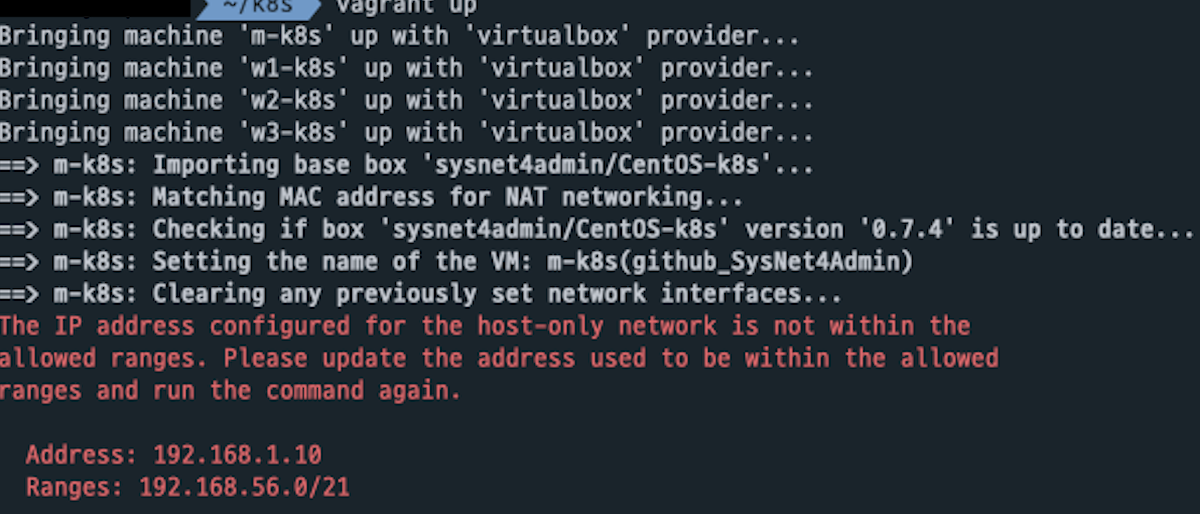 private_network ์ ๋ณด๋ฅผ 192.168.1.10 ์์ 192.168.56.10 ์ผ๋ก ๋ณ๊ฒฝํ์ฌ ์ ์ฉํ์ฌ ๋ค์ ์คํํ์๋๋ ์๋ฌ ๋ฐ์ ํ์ง ์๊ฒ๋จ.